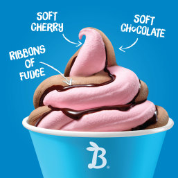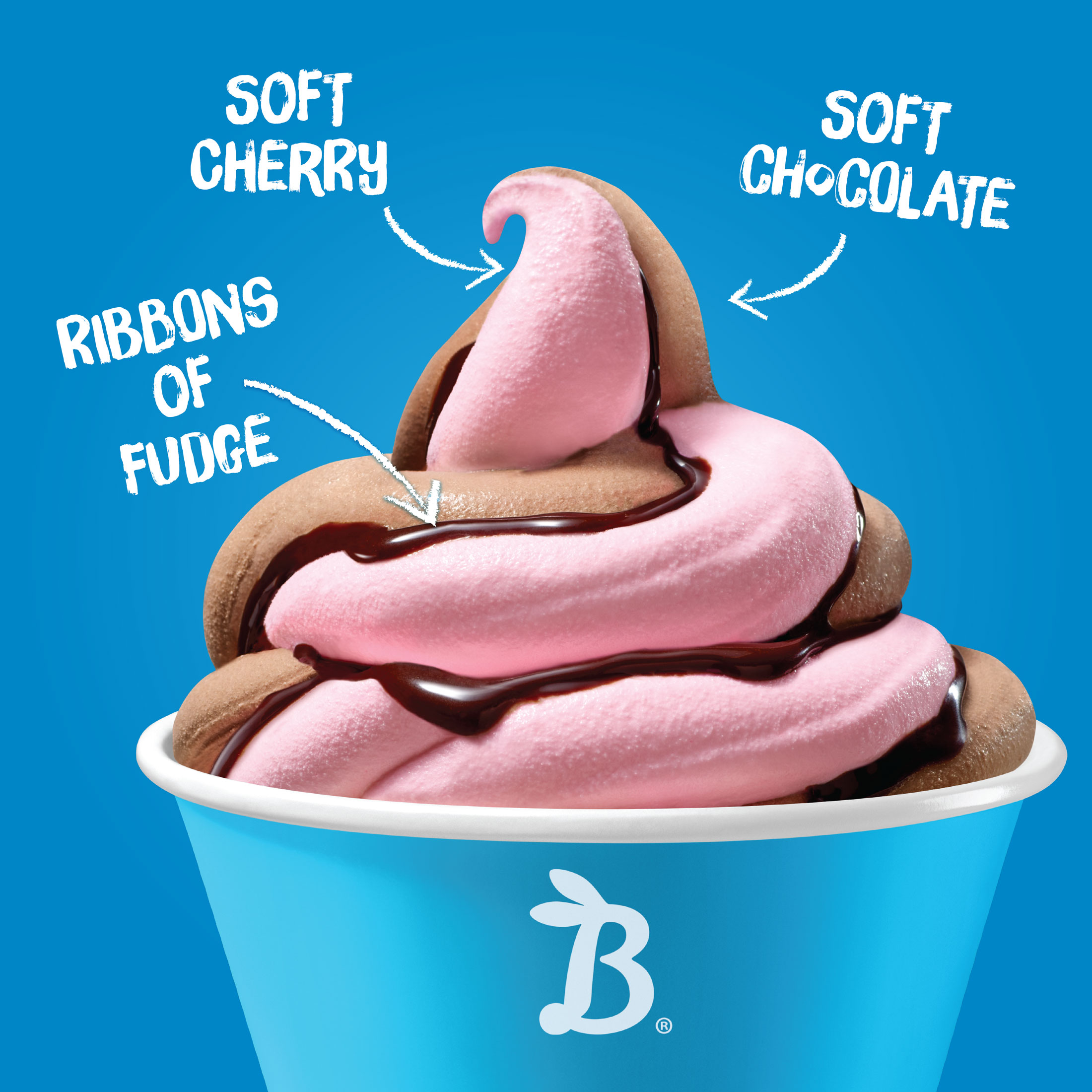 Cherry chocolate twist soft frozen dairy dessert swirled with ribbons of fudge.