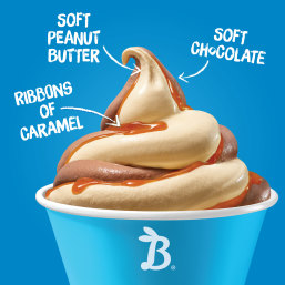 Chocolate & peanut butter twist soft frozen dairy dessert swirled with ribbons of caramel.