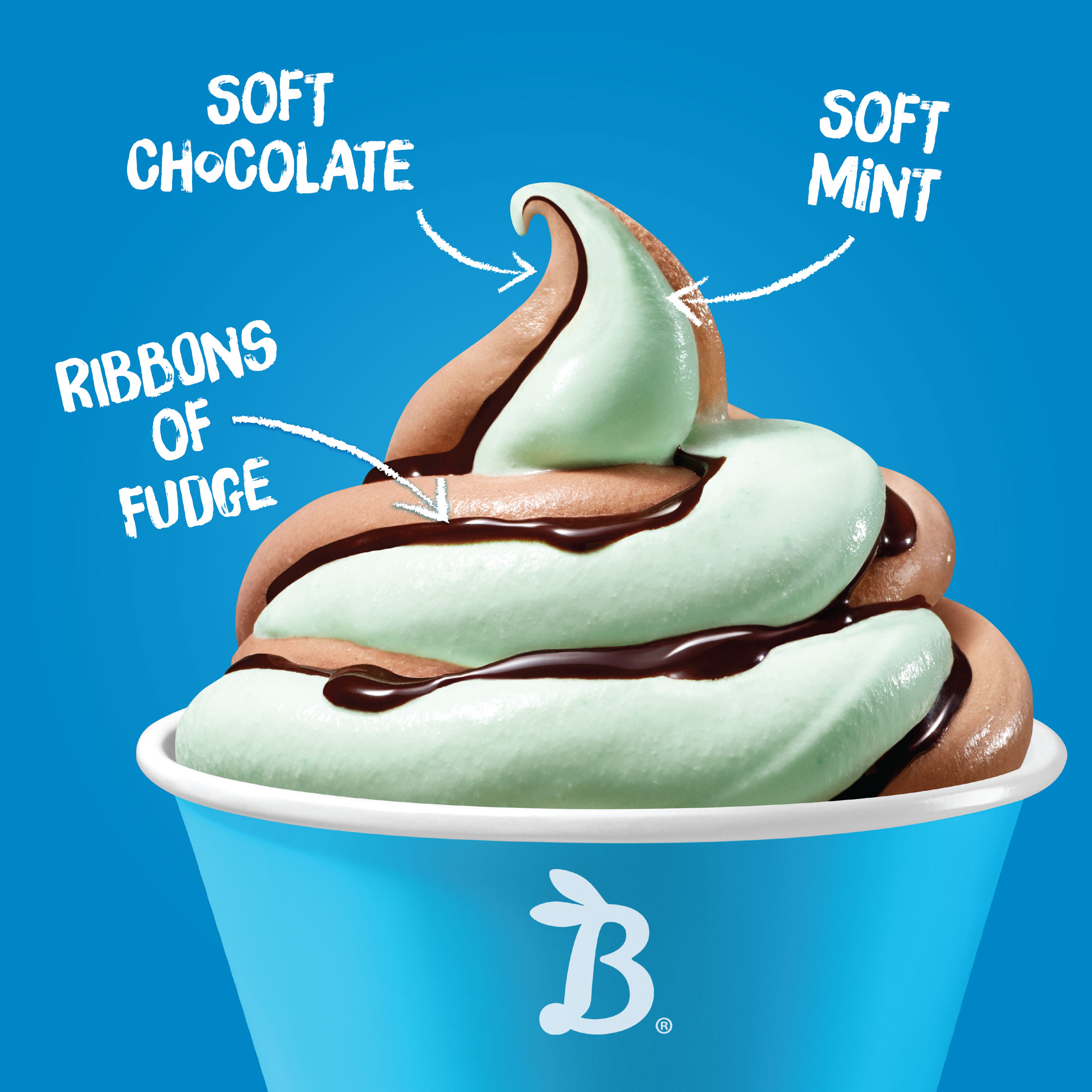 Mint chocolate twist soft frozen dairy dessert swirled with ribbons of fudge.